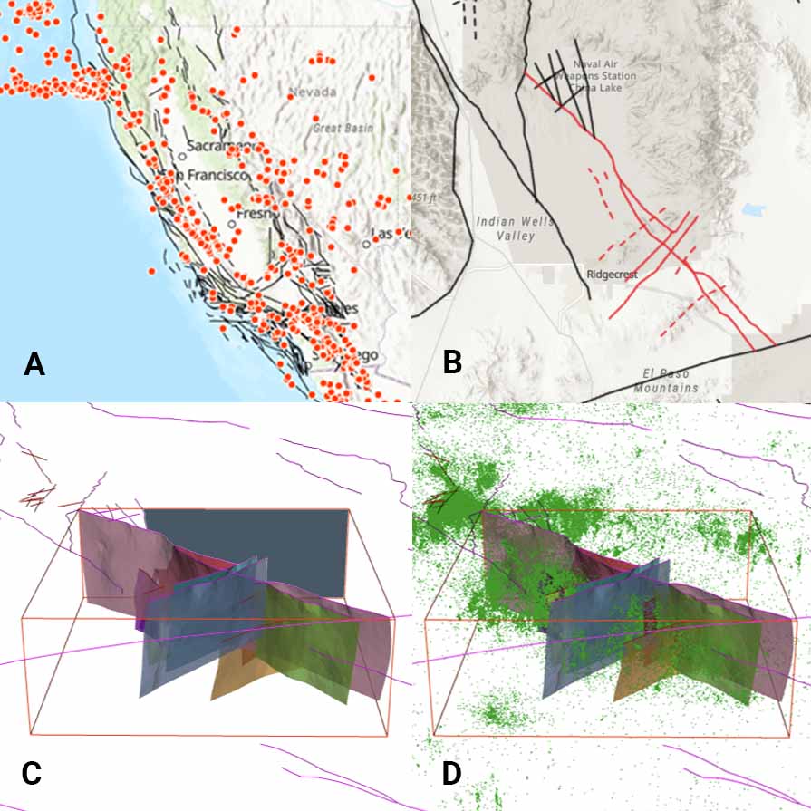 Interactively explore faults in 2D or 3D using any version of the SCEC CFM. Overlay fault objects with historic earthquakes (A) or other seismicity data (D), visualize selected faults as 3D surfaces at depth (B-D), or upload your own datasets for direct comparison.